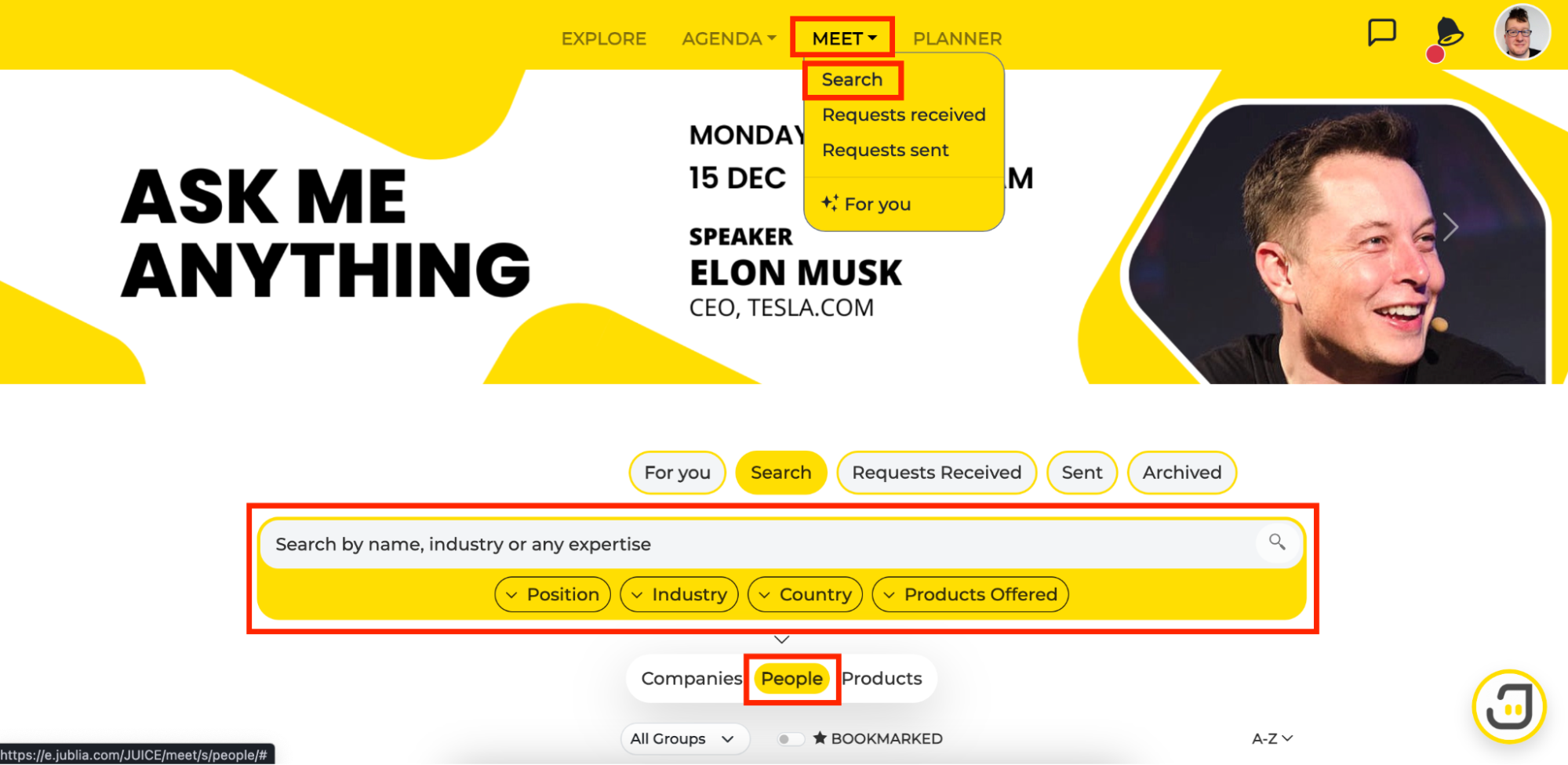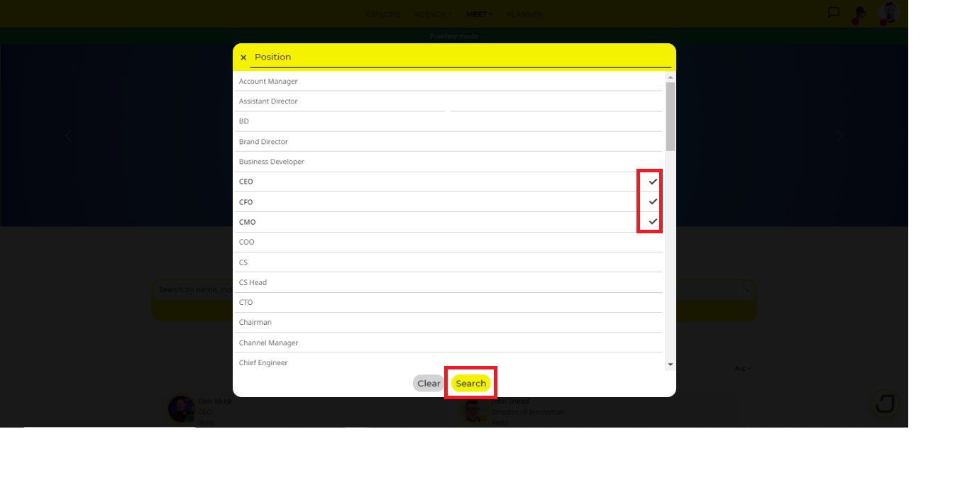 You can narrow down your search list by typing in the search bar. You can also find several dropdown options under the search bar that allow you to refine your search based on various criteria (eg. Country, Position, Industry, etc).