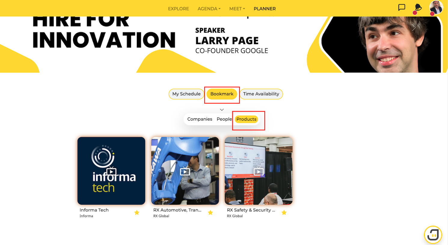 Return to the Home menu, go to the Planner via the bottom navigation bar, and select the Bookmarks tab to see your bookmarked products or company profiles.