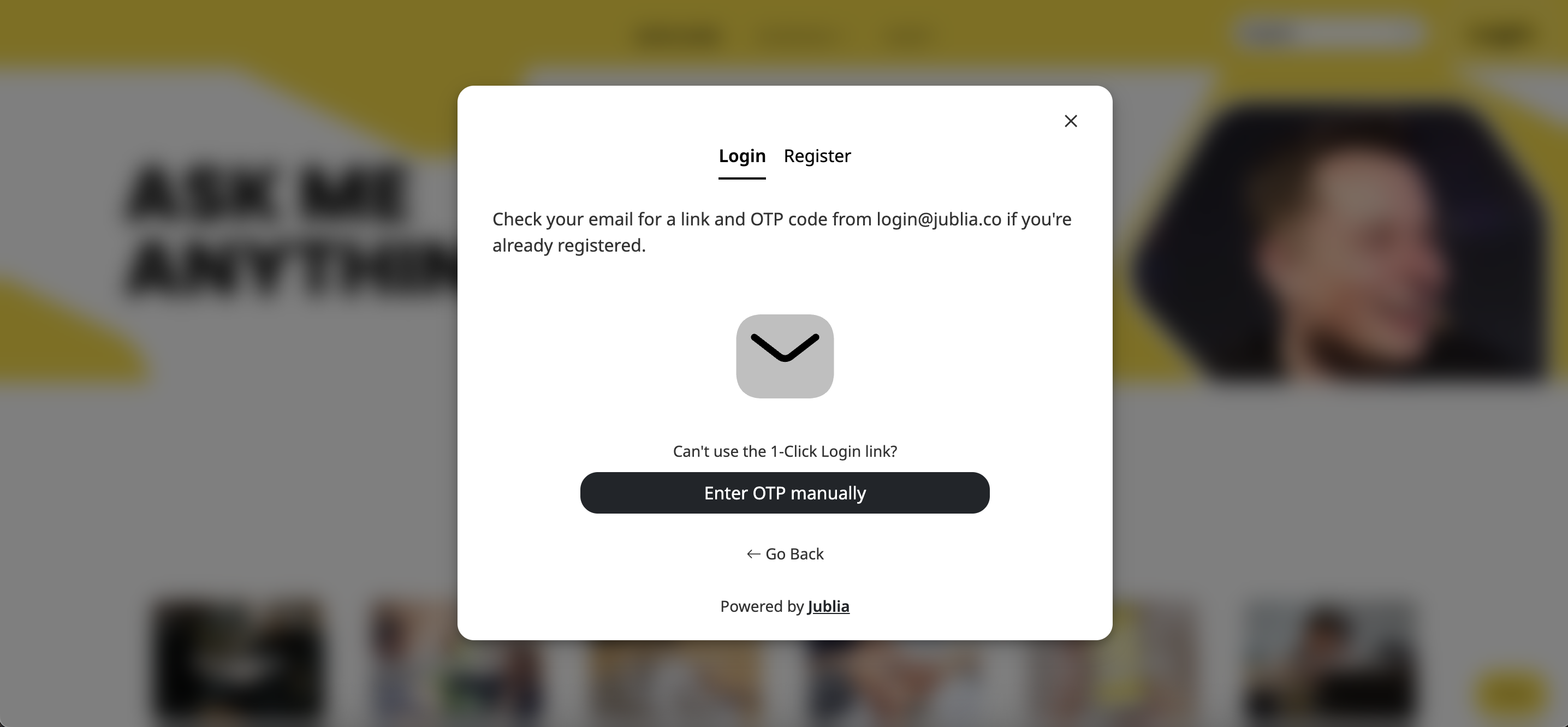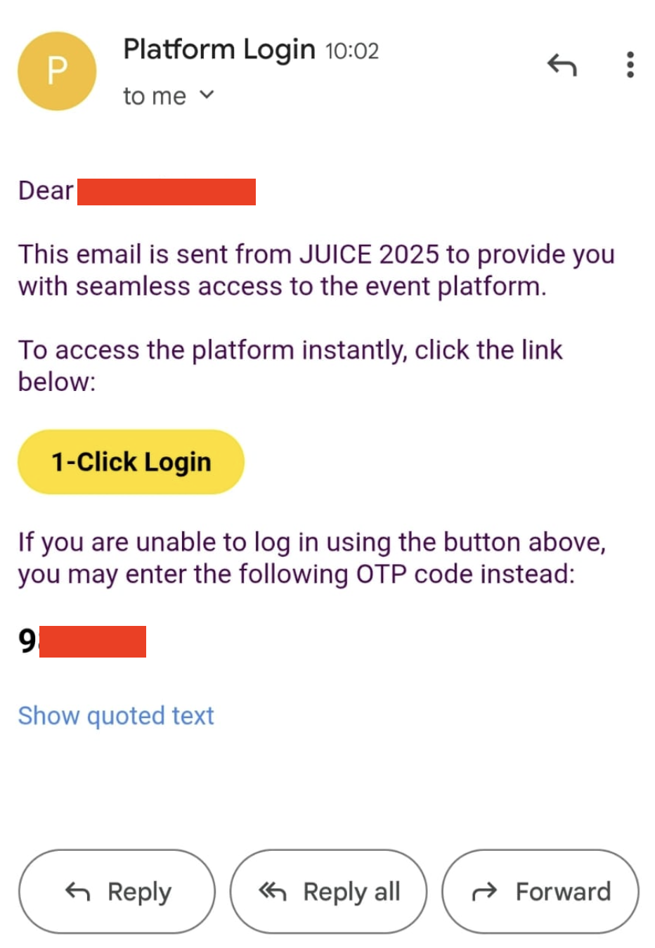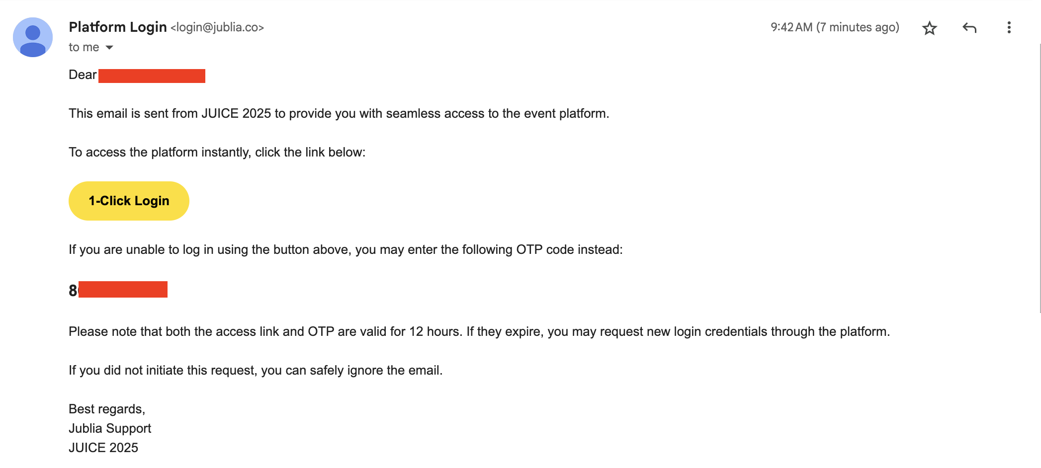 Sign in with Email (1-Click Login access or OTP): Choose Log in with Email to request a 1-Click Login access or OTP that will be sent to your registered email and use it to access the platform. The access and OTP is valid for 12 hours. Once it expires, kindly request it again through the platform.
