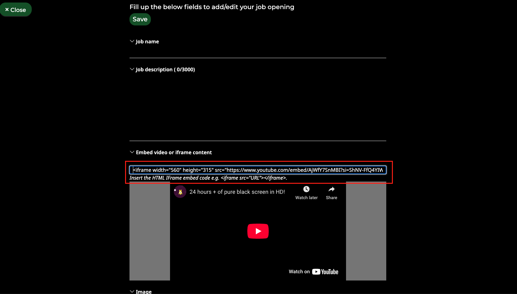 HTML Iframe & embedded content: Insert the HTML IFrame embed code (e.g Video on Youtube, go to the video page, click Share > Embed > copy the code and paste it